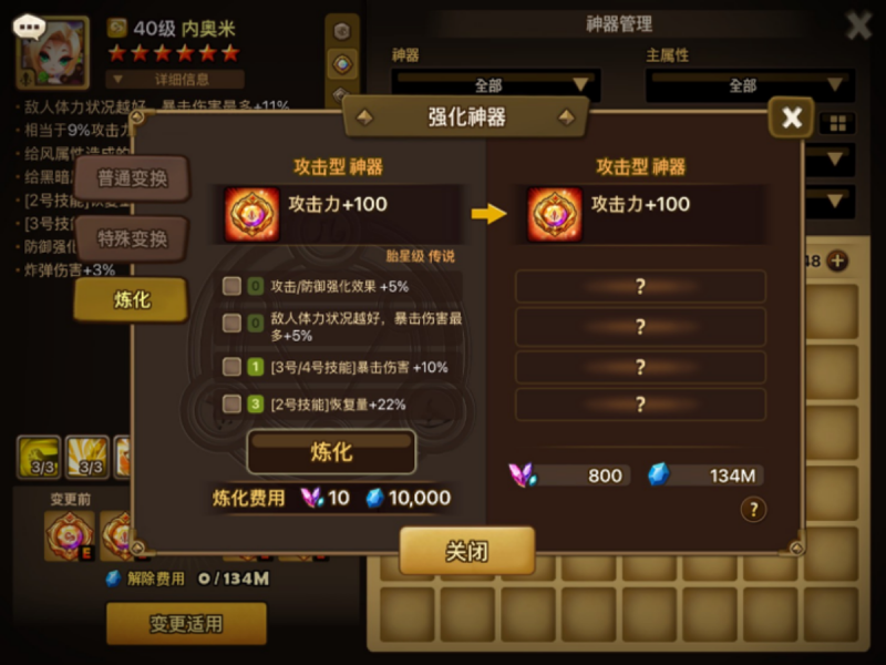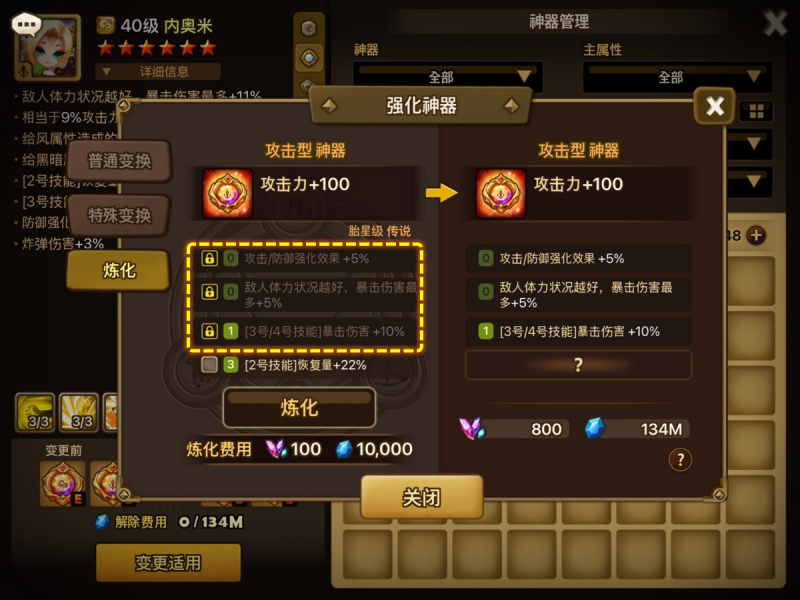 - 在炼化神器时,可以锁定部分副属性后进行炼化。