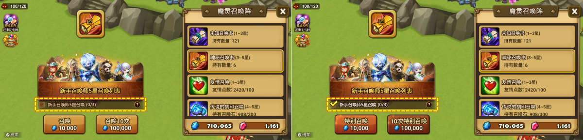 该召唤适用于神秘召唤书、传说召唤书等可召唤胎5星魔灵的所有召唤方式。在支持的召唤书上,会如效果图所示显示专属入口,可通过复选框自主选择是否启用该功能。