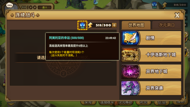 进入连续战斗菜单后,可以看到阿美利亚的幸运效果适用中的图标。