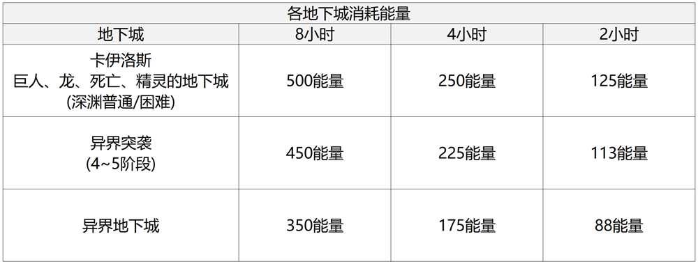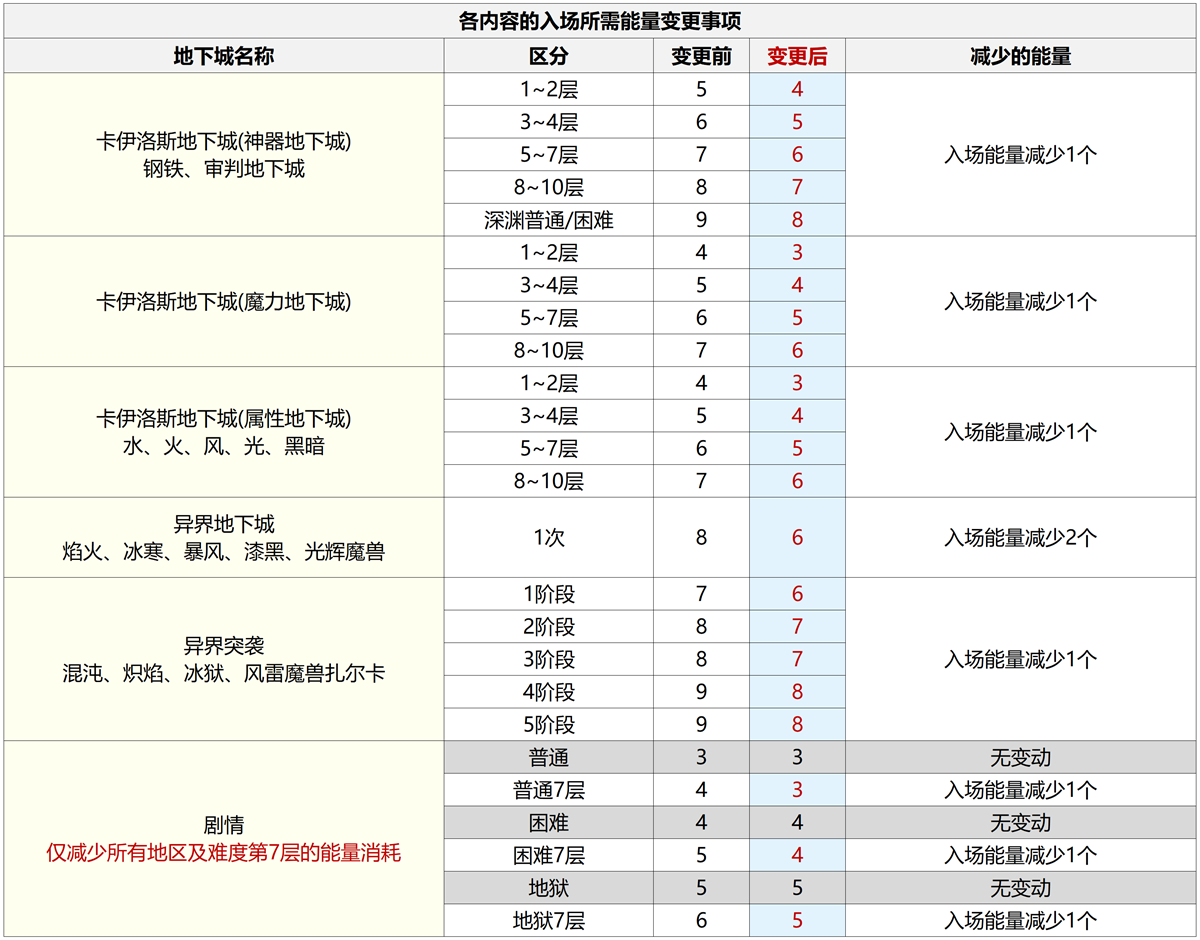 为配合能量补充速度的提升与持有量的扩充,将对各项战斗的入场能量进行如下调整,旨在使次元洞口内容达到更为合理的平衡。