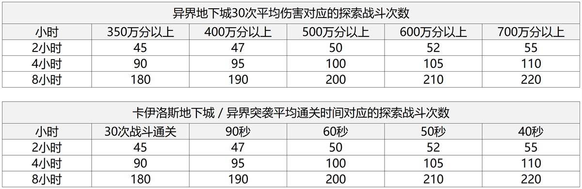 基于各地下城连续战斗的平均通关时间及分数,对应的探索战斗次数如下。