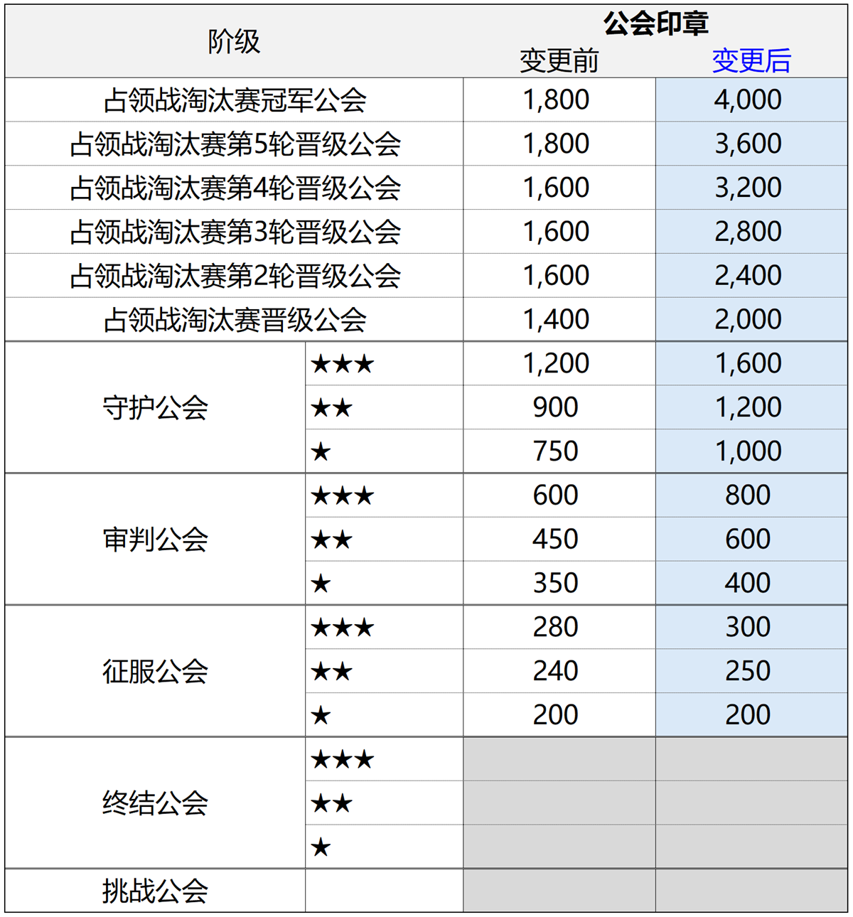 ▶ 作为占领战赛季奖励发放的“公会印章奖励”,将按以下方式进行上调。