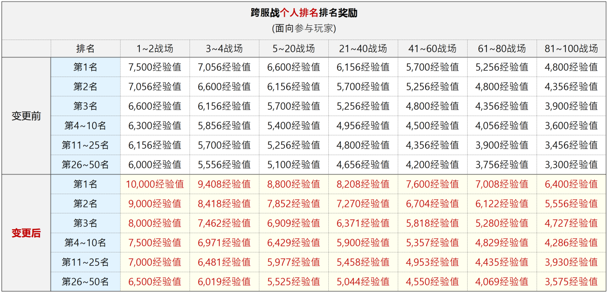 ▶ 在竞技场跨服战结束后,依据个人排名发放的名誉经验值奖励将获得提升。