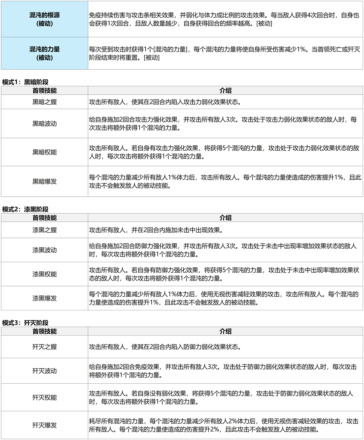 再来看看阶段技能,可以看到首领通过技能逐渐积累混沌的力量。以黑暗阶段为例,使用第2个技能时,每攻击1个处于攻击力弱化效果状态的敌人,便会积累混沌的力量;而使用第3个技能时,若首领自身持有攻击力强化效果,则额外增加5个混沌的力量。