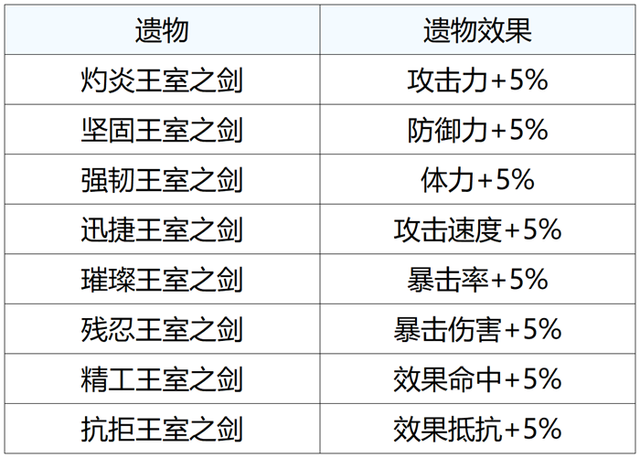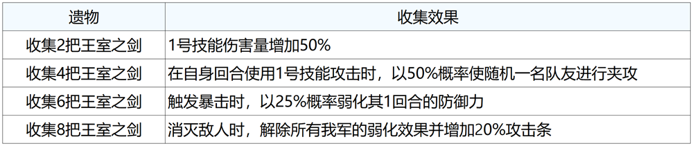 同时,当收集多个相同遗物时,除了叠加的前缀效果外,还会额外赋予特殊的遗物效果。以“王室之剑”为例,根据收集数量将额外赋予以下特殊效果。