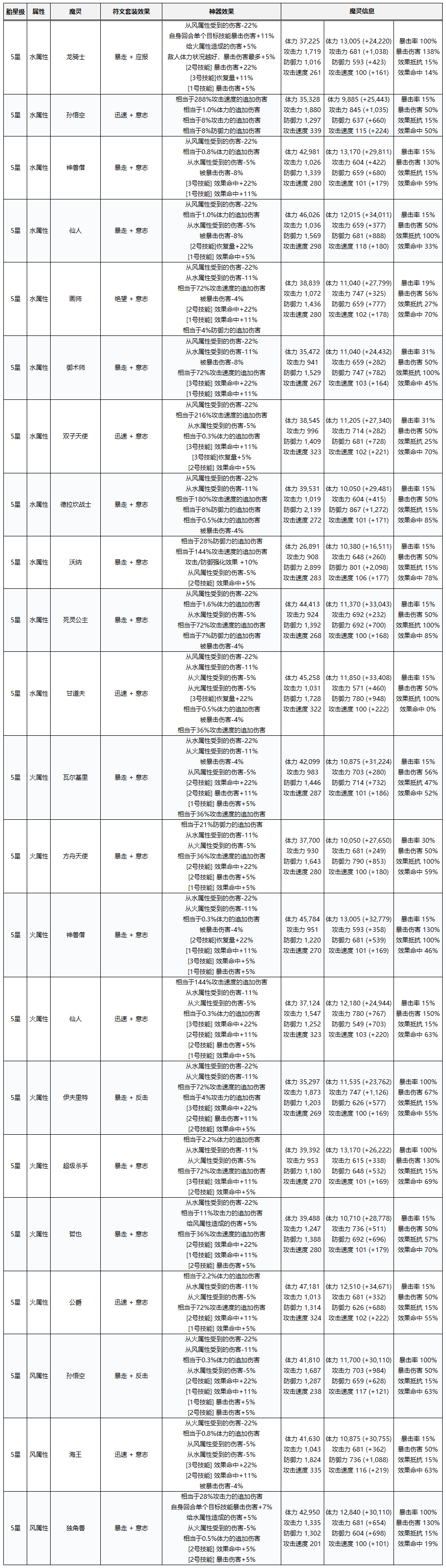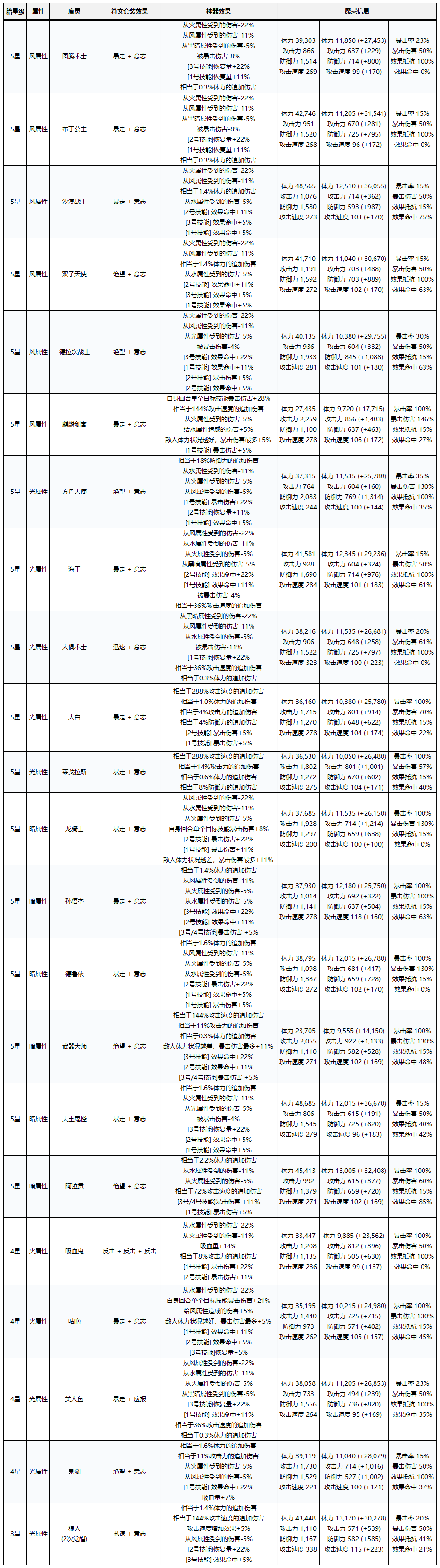 共有44只魔灵专为挑战对决提供,其各自佩戴的符文与神器的具体能力值,请在下方查看。