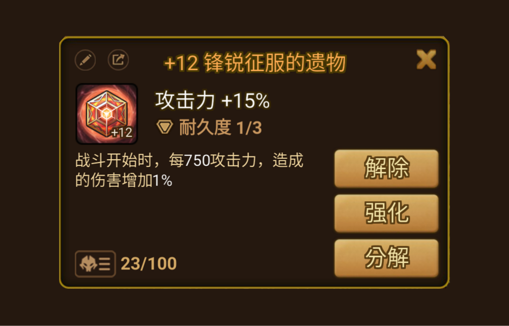 遗物在获得时,将随机从攻击力、防御力、体力中赋予一项作为主属性。