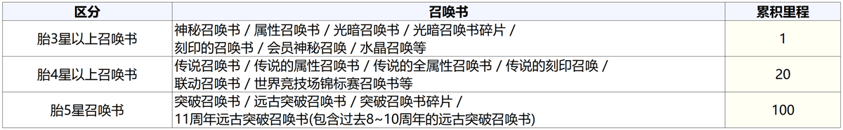可累积里程的召唤书种类及各召唤书对应的里程数值如下。