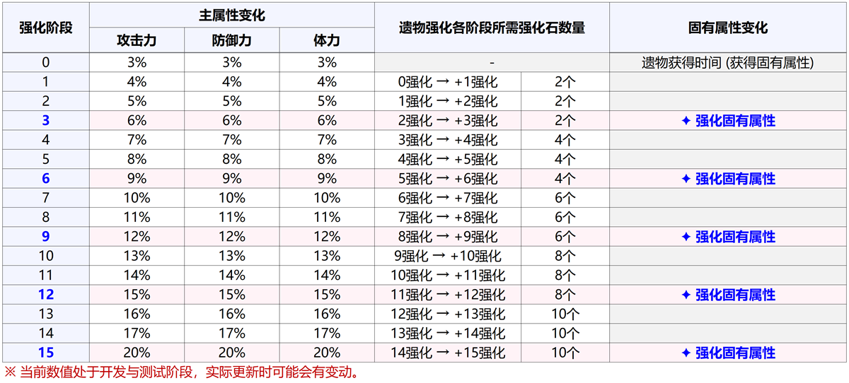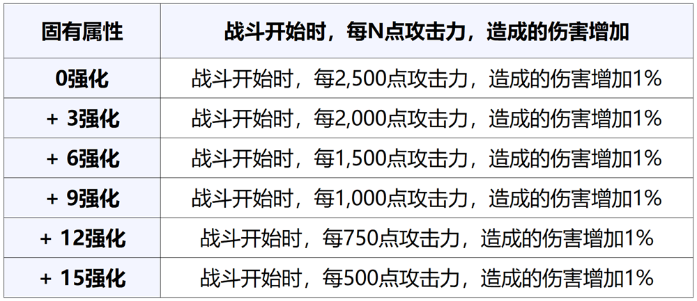 该固有属性在各强化度下赋予的数值如下。