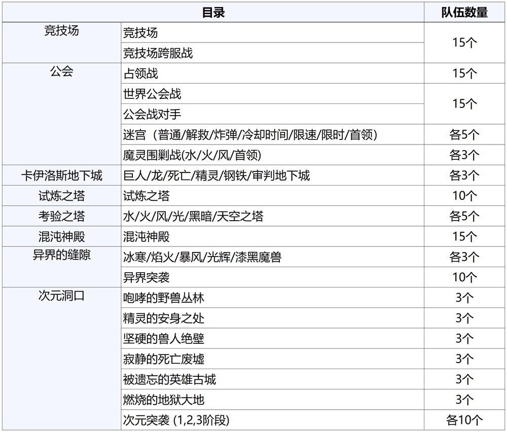 :与此同时,混沌神殿/卡伊洛斯地下城/异界魔兽/次元洞口(远古守护者)/魔灵围剿战等内容中,也将新增预设队伍功能。