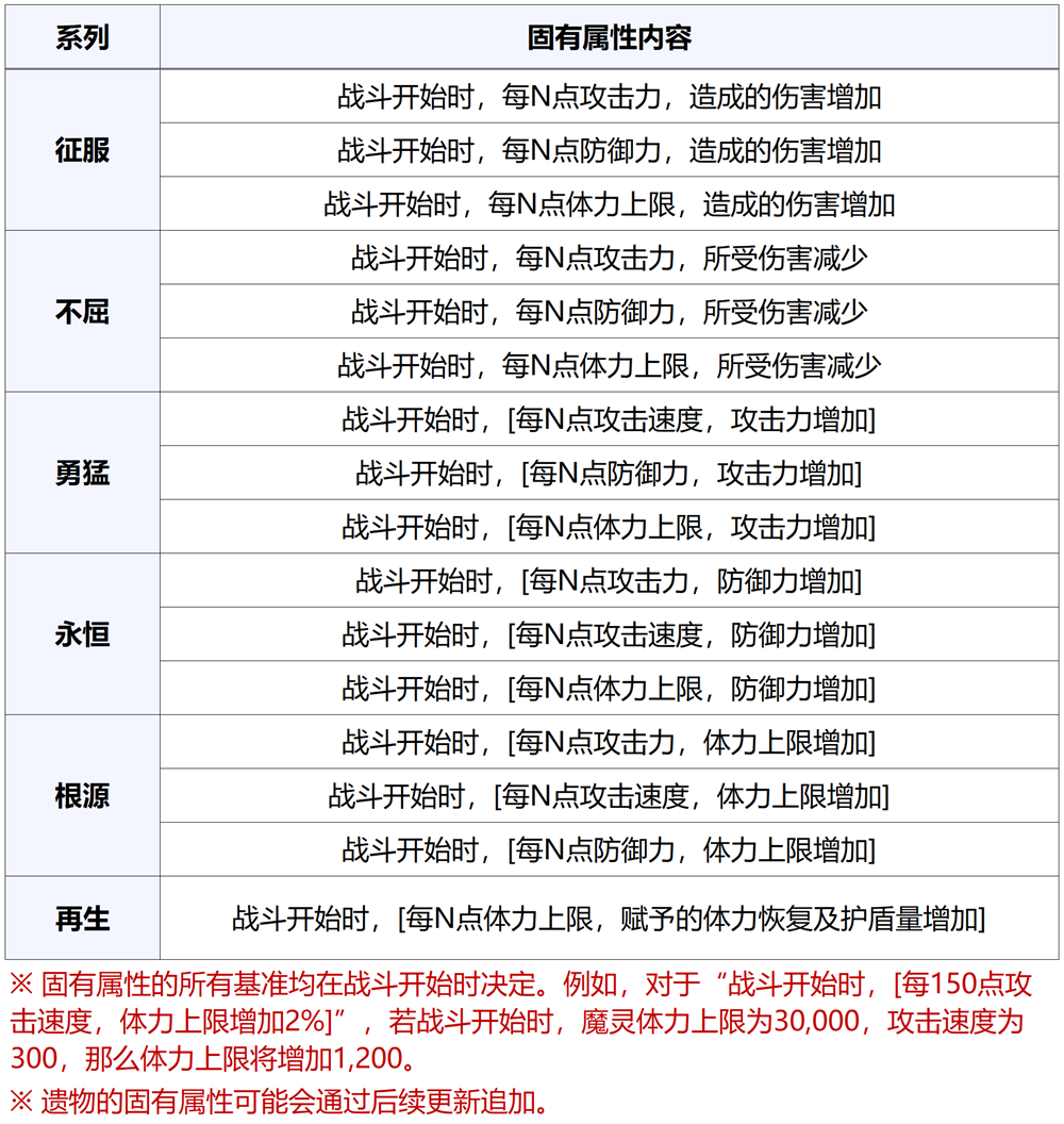 固有属性根据魔灵的能力值数值按比例触发效果。例如,遗物上可能赋予“战斗开始时,每2,500点攻击力,造成的伤害增加1%”形式的固有属性。