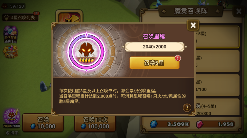 根据所使用的召唤书种类,累积的里程点数也有所不同。当累计里程达到2,000点时,即可额外召唤1只火/水/风属性的胎5星魔灵。
