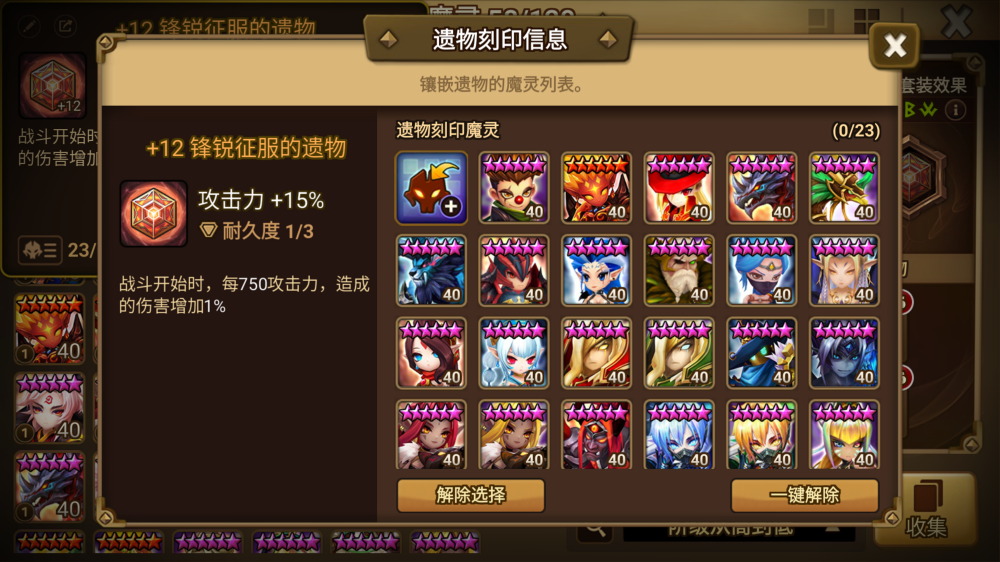 例如,若获得一个带有“根据攻击力比例增加造成的伤害”属性的遗物,则可以将其镶嵌于能够最大化攻击力的魔灵身上(如水属性龙骑士、风属性战斗天使、火属性野兽骑士等),最多可同时为100只魔灵赋予该效果。